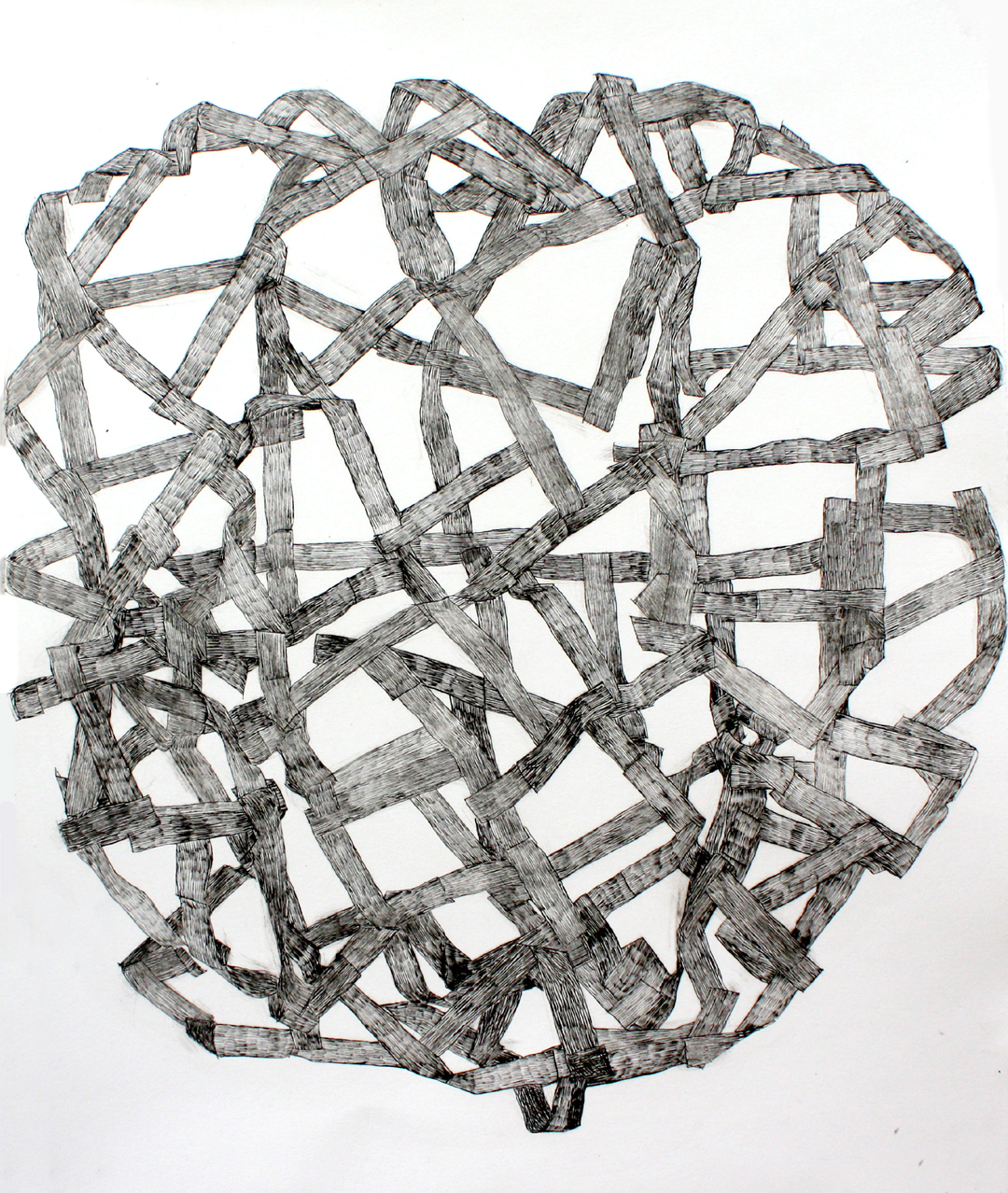 Light and volume are the twin focuses of Hepler's work and even in her drypoint prints (that she calls "Inflated Drypoints") and cyanotypes she has found a way to translate three dimensions into two by first building volumetric structures using plastic and tape. Tape forms the skeleton of the pieces.